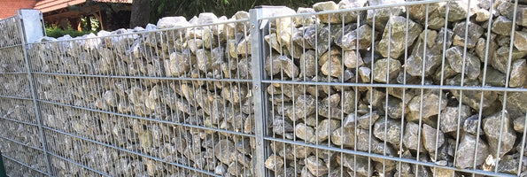 Bevor wir zu den Installationsanweisungen für den Zaun aus Gabionen übergehen, eine kurze Erklärung, was das für ein Zaun ist. Einfach gesagt - mit einem Gabionenzaun werden klassische Zäune aus Holz oder Maschendraht durch spezielle Doppelstabmattenzäune ersetzt, die mit Ziersteine gefüllt werden. Dies können Feldsteine, dekorative Steine, aber auch Gesteine wie Dolomit oder Sandstein sein.